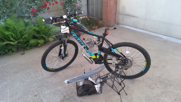 С виду показалось что установка будет простой. Но на деле пришлось пилить, точить, сверлить, нарезать. Руль оказался из какого то космического металла, кобальтовое сверло с горем пополам взяло. Бензобак постарались как можно ближе к подседельной трубе расположить, осталось место для багажа. Двигатель ощутимо усилил раму за счёт своего крепежа.
