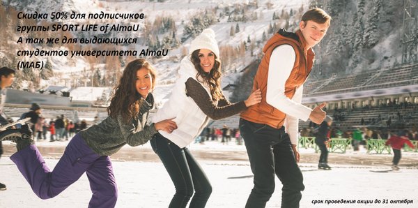 Доброго времени суток! Спортивный магазин Velik.кз проводит уникальную Акцию!!) СКИДКА 50% НА ПРОКАТ КОНЬКОВ для подписчиков группы SPORT LIFE of AlmaU А так же скидка 50% для студентов университета AlmaU (МАБ) ПОДЕЛИСЬ ДАННОЙ ЗАПИСЬЮ И БУДЬ ПЕРВЫМ!!!))) ПОДПИСЫВАЙСЯ НА ОФИЦИАЛЬНУЮ ГРУППУ В КОНТАКТЕ МАГАЗИНА Velik.кз и будь в курсе всех акции!!!)) Наши контакты:, Сейчас мы находимся во Дворце Спорта, пр. Абая, 44, уг. ул. Байтурсынова (вход с Байтурсынова, 10 метров от станции Метро «Байконур») Срок проведения акции ограничен!