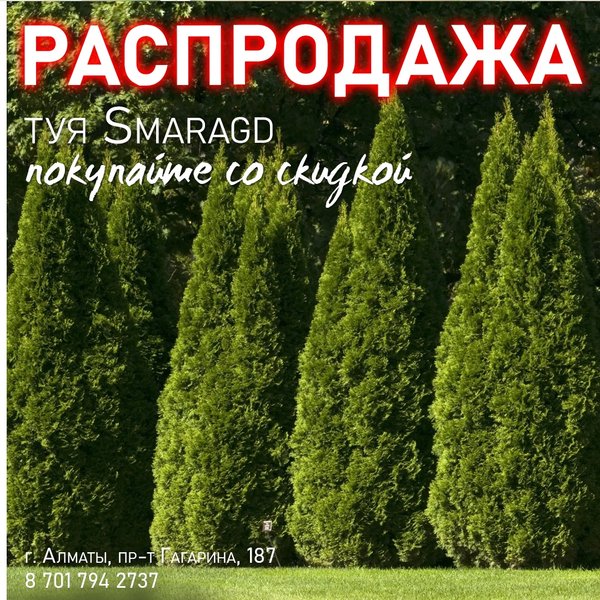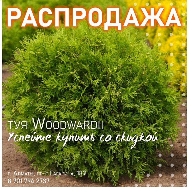 привлекательности и летом, и зимой. ⠀⠀⠀⠀⠀⠀⠀⠀ Туя западная Woodwardii заинтересует тех, кто хочет день за днем видеть на участке красивое крепкое растение с компактной, напоминающей шар кроной, темной, плотно усыпающей ветки хвоей и покладистым нравом. ⠀⠀⠀⠀⠀⠀⠀⠀ Посаженный в грунт в возрасте 2–3 лет кустарник только к 10 годам вырастает до полутораметровой высоты. Впоследствии рост продолжается, но его темпы становятся еще ниже. ⠀⠀⠀⠀⠀⠀⠀⠀ Сейчас у вас есть возможность приобрести саженцы этого восхитительного сорта туи всего за 2500 тенге. Высота саженцев 30/+ см. ⠀⠀⠀⠀⠀⠀⠀⠀ Приезжайте в питомник и выбирайте растения в полях! Копать растения начнём в марте, как только оттает грунт. Бронь растений действительна при предоплате. Количество растений ограничено. ⠀⠀⠀⠀⠀⠀⠀⠀ Питомник на капчагайской трассе , ⏰ 09:00 - 18:00
