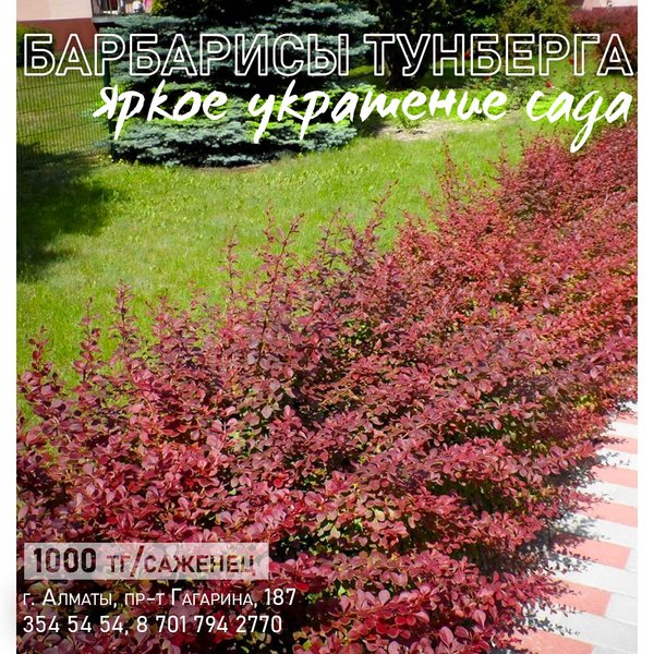 ть в саду в качестве живой изгороди; * Растение выделяется своей высокой привлекательностью осенью. В этот период сочетание окраса листвы и плодов задает культуре красочный и примечательный облик; * Кроме того, даже после листопада яркие красные ягоды еще надолго задерживаются на ветвях, создавая особое украшение; * Барбарисы, вне зависимости от размеров куста, можно выращивать на открытых солнечных участках, а также сажать в полутени, в которой барбарис не утратит своей привлекательности. * Также эта культура стойко переносит загрязненность воздуха. Именно поэтому подобную живую изгородь можно высаживать вдоль дороги. ⠀⠀⠀⠀⠀⠀⠀⠀⠀⠀⠀⠀⠀⠀⠀⠀⠀ Саженцы барбарисов доступны в нашем магазине. Приходите! ⠀⠀⠀⠀⠀⠀⠀⠀⠀⠀⠀⠀⠀⠀⠀ Алматы, пр-т Гагарина 187 (выше ул. Утепова, справа)
