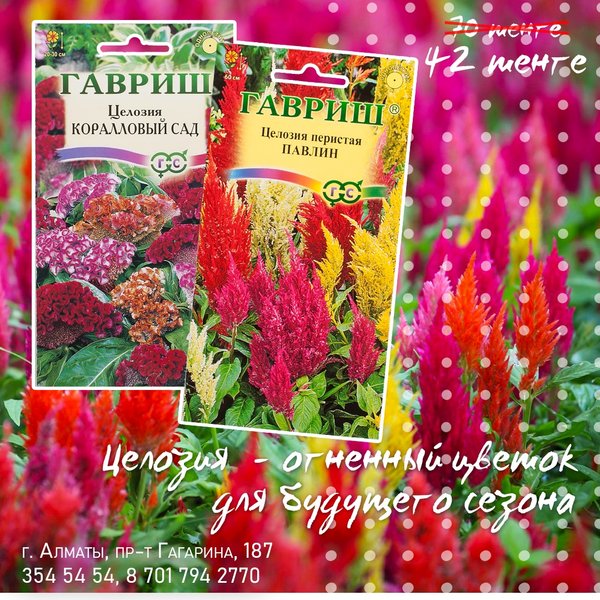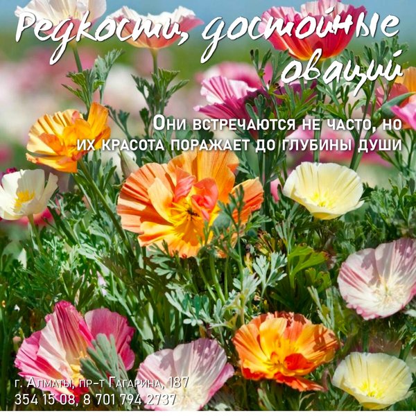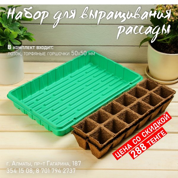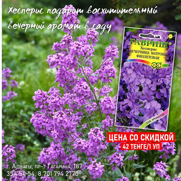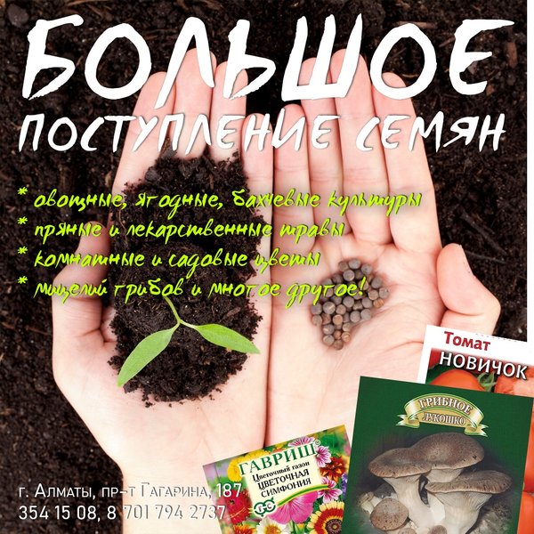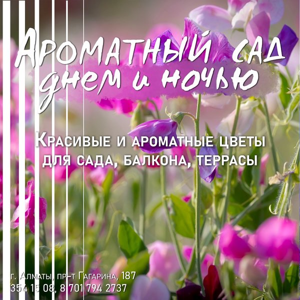 см длиной, очень душистые, собраны в крупное, рыхлое, метельчатое соцветие. Открываются главным образом ночью и тогда наиболее ароматны. ⠀⠀⠀⠀⠀⠀⠀⠀ Агротехника: Предпочитает открытые солнечные места с умеренно плодородными и влажными почвами. При посеве на рассаду семена не присыпают почвой. Всходы появляются через 10—12 дней. Первую пикировку проводят в ящики, вторую — в горшки по 4 штуки. Табак — растение холодостойкое, но в открытый грунт его высаживают только после окончания весенних заморозков. ⠀⠀⠀⠀⠀⠀⠀⠀ Душистый горошек Импровизация — 70 тг/уп 0,5 гр Среднерослый душистый горошек для ранней срезки и озеленения балконов. Цветки обладают приятным тонким ароматом. ⠀⠀⠀⠀⠀⠀⠀⠀ Душистый горошек Баттерфляй — 70 тг/уп 1 гр С горошком Баттерфляй любой балкон превратится в уютный благоухающий уголок. Сладкий и нежный аромат цветков «оживит атмосферу», поднимет настроение. С июня по сентябрь ваш балкон будет в веселом разноцветье. Горошек — растение лазящее, нуждается в опоре. Развиваются растения быстро, легко «завоевывая» высоту в 1,5—2 м. ⠀⠀⠀⠀⠀⠀⠀⠀ Агротехника: Светолюбив, влаголюбив и холодостоек, предпочитает плодородные суглинистые и супесчаные почвы. Выращивают рассадным и безрассадным способом. В открытый грунт посев проводят в первой декаде мая. Семена перед посевом желательно прорастить На рассаду семена высевают в конце марта-начале апреля в горшочки. Всходы появляются через 10—14 дней. Рассаду высаживают в середине мая на расстоянии 15 см. ⠀⠀⠀⠀⠀⠀⠀⠀ Алматы, пр-т Гагарина 187 (выше ул. Утепова, справа)