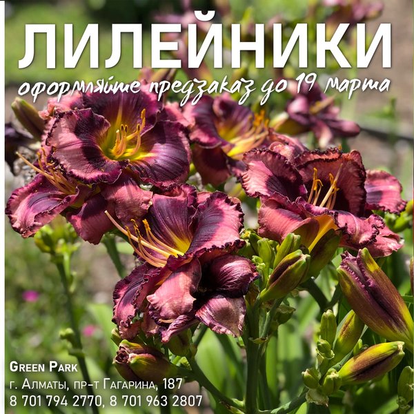 тниками: хосты, астильбы, флоксы, розы. Подходит для срезки, отлично сохраняет свежесть в букете. ⠀⠀⠀⠀⠀⠀⠀⠀⠀⠀⠀⠀⠀⠀⠀⠀⠀ Про лилейник уверенно можно сказать «растет сам по себе». К почве не требователен, устойчив к недостатку увлажнения. Прекрасно зимует без укрытия. Продолжительность выращивания на одном месте: 5—6 лет (возможно до 10). ⠀⠀⠀⠀⠀⠀⠀⠀⠀⠀⠀⠀⠀⠀⠀⠀⠀ Сейчас в нашем магазине доступны саженцы лилейников в контейнерах. Количество ограничено! ⠀⠀⠀⠀⠀⠀⠀⠀⠀⠀⠀⠀⠀⠀⠀⠀⠀ Сейчас вы можете оформить предзаказ на лилейники у @greenparkalmaty Заказы принимаются до 19 марта. ⠀⠀⠀⠀⠀⠀⠀⠀ Green Park Алматы, пр-т Гагарина 187 (выше ул. Утепова, справа)