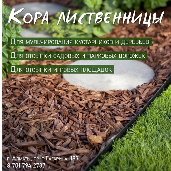 рунте, грунт больше не нужно регулярно взрыхлять. ⠀⠀⠀⠀⠀⠀⠀⠀ Лиственница — это очень ценная порода, она почти не повреждается древоточцами, многими вредителями, болезнями и грызунами. Сама она не повреждается плесенью и грибками. Короед также не ест лиственницу. И еще одним достоинством мульчи из лиственницы является то, что при ее производстве не применяется химическая обработка, соответственно химреактивы не попадут в ваш сад. ⠀⠀⠀⠀⠀⠀⠀⠀ Кора лиственницы греет почву зимой и остужает в летнюю пору, удерживая температуру почвы на оптимальном уровне, а при перегреве она превращается в гумус и дает почве необходимые вещества и минералы, удобряя её. ⠀⠀⠀⠀⠀⠀⠀⠀ Обновляется мульча из коры лиственницы не каждый год, но реже чем сосновая (чем крупнее фракция — тем реже, у крупных фракций вплоть до 5 лет). Также обладает бОльшими декоративными качествами, чем сосновая кора, у нее насыщеннее древесный цвет. Цвет мульчи может зависеть от того, насколько влажно, и приобретает различные оттенки: от свекольного, розового до шоколадного и светло-коричневого. После небольшого дождя в саду поселится приятный аромат хвои. ⠀⠀⠀⠀⠀⠀⠀⠀ Кора фракции 3—5 см, 60 л — 3 055 тенге Кора фракции 5—10 см, 60 л — 3 295 тенге ⠀⠀⠀⠀⠀⠀⠀⠀ Алматы, пр-т Гагарина 187 (выше ул. Утепова, справа)