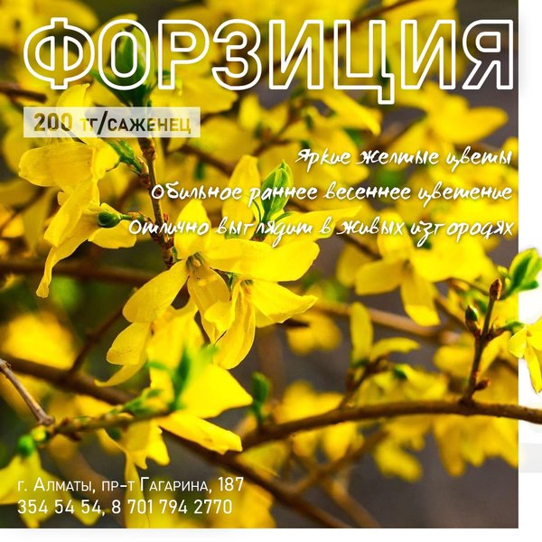 устарник не теряет своей привлекательности и до конца осени: вслед за похожим на взрыв цветением кусты украшает очень густая ярко-зеленая крона, сменяющаяся ослепительным осенних нарядом. Форзиция хорошо смотрятся и в однорядных, и в сложных изгородях в комбинации с классическими цветущими позже кустарниками. ⠀⠀⠀⠀⠀⠀⠀⠀⠀⠀⠀⠀⠀⠀⠀⠀⠀ Изгороди из форзиции можно выращивать на солнечных или полутенистых участках. Этот кустарник хорошо адаптируется к разному освещению, но требует защиты от сквозняков и ветров. Для яркого и обильного цветения необходимо подобрать действительно качественные почвы, дренированные и питательные. ⠀⠀⠀⠀⠀⠀⠀⠀⠀⠀⠀⠀⠀⠀⠀⠀⠀ Саженцы форзиции доступны в нашем магазине со скидкой! Стоимость саженца в горшочке 9х9 см составляет всего 200 тг! ⠀⠀⠀⠀⠀⠀⠀⠀⠀⠀⠀⠀⠀⠀⠀ Алматы, пр-т Гагарина 187 (выше ул. Утепова, справа)