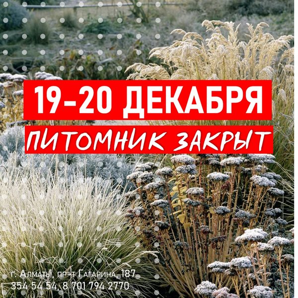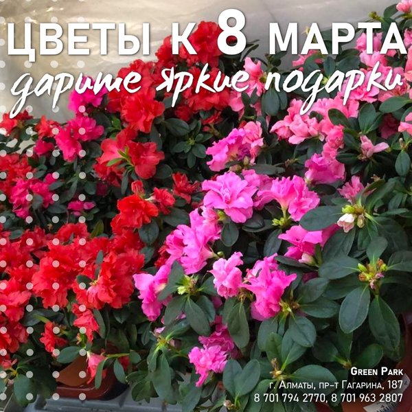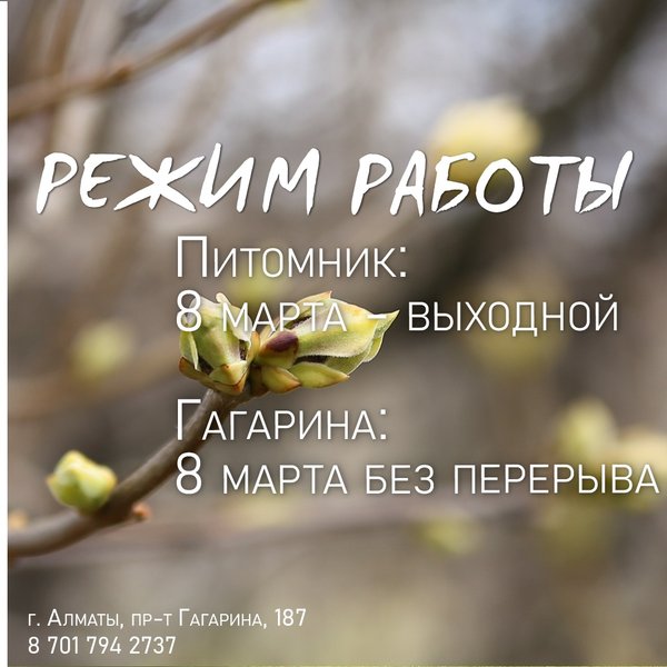 8 марта в питомнике будет выходной. Телефон для справок:, ⠀⠀⠀⠀⠀⠀⠀⠀ Магазин на Гагарина работает в обычном режиме — ежедневно, с 9:00 до 18:00 ⠀⠀⠀⠀⠀⠀⠀⠀ Алматы, пр-т Гагарина 187 (выше ул. Утепова, справа)
