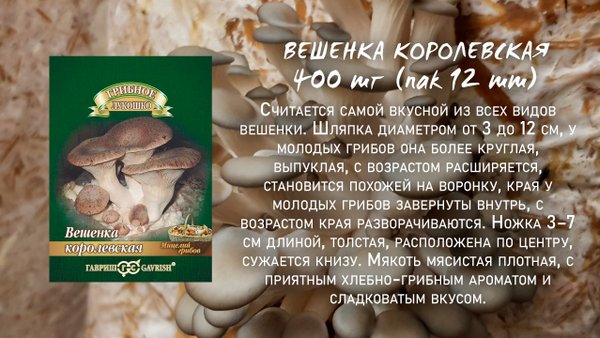 льха, осина, клен, береза, тополь, ива, каштан, дуб) без признаков гнили, с корой и без веток. Если древесина сухая ее замачивают в воде на 2—3 дня, избытку воды дают стечь. Пропитанную древесину помещают в теплое, проветриваемое помещение на несколько дней. ⠀⠀⠀⠀⠀⠀⠀⠀ I этап 1. В подготовленном бревне просверливают отверстия диаметром 0,8 см и длиной 4 см в шахматном порядке на расстоянии около 10 см друг от друга. 2. Вставляют грибные палочки в отверстия до упора (операцию проделывают в стерильных перчатках или продезинфецированными спиртом руками). 3. Оборачивают бревно полиэтиленовой пленкой, сделав небольшие отверстия для доступа воздуха. 4. Помещают бревно в темное влажное помещение и оставляют обрастать мицелием. При температуре 20 °С бревно обрастает 2—3 месяца, при температуре 10 °С – 3—4 месяца. При температуре выше 34 °С мицелий может погибнуть. Бревна заросли если на поверхности, в местах заражения, виден белый мицелий. ⠀⠀⠀⠀⠀⠀⠀⠀ II этап 1. В затененном и защищенном от ветра месте в саду выкапывают лунку глубиной 10—15 см, дно лунки увлажняют. Можно выращивать на балконе, посадив древесину после оброста мицелием в кадку с землей. 2. Обросшее грибницей бревно закапывают вертикально одним концом на глубину до 1/3—1/2 длины. Обсыпают почву вокруг бревна древесной золой (для борьбы с улитками). Оптимальная температура для образования плодовых тел – от 15 до 25°С. 3. В сухую погоду почву вокруг бревна поливают каждую неделю из расчета 5л на 1м. Поздней осенью бревно присыпают листьями и оставляют зимовать. 4. Со следующей весны закладку регулярно увлажняют, сначала 1 раз в неделю, а во время фазы созревания — каждый день. Если полив прекратить, вешенка будет расти только в сырую погоду. ⠀⠀⠀⠀⠀⠀⠀⠀ Плодоношение: Первый урожай при выращивании на мягкой древесине (тополь, береза, ива) — через 4 месяца, на твердой (бук, клен, рябина) – через 8 месяцев. Урожайность: От 20 до 50% от веса бревна. Состав: Мицелий грибов «Вешенка индийская» на древесных палочках. Невскрытый пакет хранить в сухом прохладном месте, возможно в холодильнике при положительной температуре. ⠀⠀⠀⠀⠀⠀⠀⠀ Алматы, пр-т Гагарина 187 (выше ул. Утепова, справа)