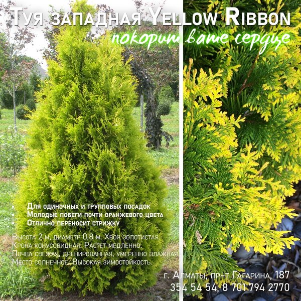 конусовидная. Растет медленно. Почва свежая, дренированная, умеренно влажная. Место солнечное. Высокая зимостойкость. ⠀⠀⠀⠀⠀⠀⠀⠀⠀⠀⠀⠀⠀⠀⠀⠀⠀ В нашем магазине сейчас доступно ограниченное количество саженцев туи сорта Yellow Ribbon! Стоимость составляет 2000 тенге. Просим дополнительно уточнять наличие саженцев на Гагарина по телефону. ⠀⠀⠀⠀⠀⠀⠀⠀⠀⠀⠀⠀⠀⠀⠀⠀⠀ Алматы, пр-т Гагарина 187 (выше ул. Утепова, справа)