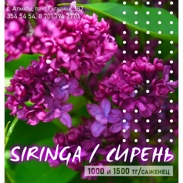 ии. Можно создать однотонные изгороди, подбирая растения, близкие по окраске цветков, или использовать цветовые контрасты. ⠀⠀⠀⠀⠀⠀⠀⠀⠀⠀⠀⠀⠀⠀⠀ Красиво выглядит сирень в саду, посаженная вблизи искусственного прудика, особенно если ее ветви отражаются в водной глади. Очень выигрышно сиреневый куст смотрится на фоне хвойных растений с темно-зеленой или серебристой хвоей (ель, можжевельник). Романтично в дальнем углу сада смотрится одинокая скамья, скрытая от посторонних глаз пышными кустами сирени. ⠀⠀⠀⠀⠀⠀⠀⠀⠀⠀⠀⠀⠀⠀⠀ Если вы хотите украсить свой участок этим замечательным растение, то за саженцами приходите в наш магазин. Саженцы продаются со скидкой — по цене 1000 и 1500 тенге за саженец. ⠀⠀⠀⠀⠀⠀⠀⠀⠀⠀⠀⠀⠀⠀⠀ Алматы, пр-т Гагарина 187 (выше ул. Утепова, справа)