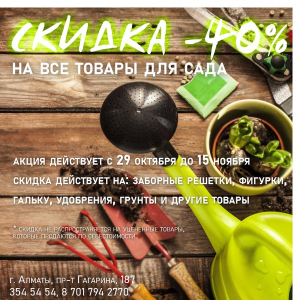 СКИДКА 40% НА ТОВАРЫ ДЛЯ САДА ⠀⠀⠀⠀⠀⠀⠀⠀⠀⠀⠀⠀⠀⠀⠀ В нашем Садовом центре с 29 октября до 15 ноября будет действовать скидка на все товары для сада. Со скидкой вы сможете приобрести удобрения, грунты, химию для обработки сада, садовый инвентарь, заборные решетки, фигурки, фонтаны, горшки и многое другое! ⠀⠀⠀⠀⠀⠀⠀⠀⠀⠀⠀⠀⠀⠀⠀ Скидка не распространяется на уцененные товары, которые уже продаются по себестоимости. ⠀⠀⠀⠀⠀⠀⠀⠀⠀⠀⠀⠀⠀⠀⠀ Ждем вас. Мы работаем без перерыва и выходных! ⠀⠀⠀⠀⠀⠀⠀⠀⠀⠀⠀⠀⠀⠀⠀ Алматы, пр-т Гагарина 187 (выше ул. Утепова, справа)