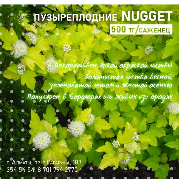 et». ⠀⠀⠀⠀⠀⠀⠀⠀⠀⠀⠀⠀⠀⠀⠀⠀⠀ Главное достоинство этого сорта – пышная листва насыщенного лимонно-желтого цвета, которая на протяжении всего теплого сезона меняет свой оттенок. Ранней весной она имеет чистый желтый цвет, летом появляется зеленоватый оттенок, а осенью листва приобретает великолепный насыщенный желтый цвет. Крупные, гофрированные, пильчато-зубчатые листочки на раскидистых поникающих ветвях образуют густую крону шаровидной формы. ⠀⠀⠀⠀⠀⠀⠀⠀⠀⠀⠀⠀⠀⠀⠀⠀⠀ Цветение продолжается около трех недель примерно с середины июля. В это время кустарник усыпан соцветиями белого или нежно-розового цвета. Мелким цветочкам особый эффект придают красные пушистые тычинки. Зачастую повторное цветение наблюдается в конце лета. ⠀⠀⠀⠀⠀⠀⠀⠀⠀⠀⠀⠀⠀⠀⠀⠀⠀ Осенью на кустах становятся заметными вздутые плоды, которые к этому времени начинают краснеть. Калинолистный пузыреплодник сорт Nugget достигает в высоту 2 метров. Кустарнику можно с помощью стрижки придать любую садовую форму, хотя в естественном виде компактная крона имеет красивую форму шара. ⠀⠀⠀⠀⠀⠀⠀⠀⠀⠀⠀⠀⠀⠀⠀⠀⠀ Алматы, пр-т Гагарина 187 (выше ул. Утепова, справа)