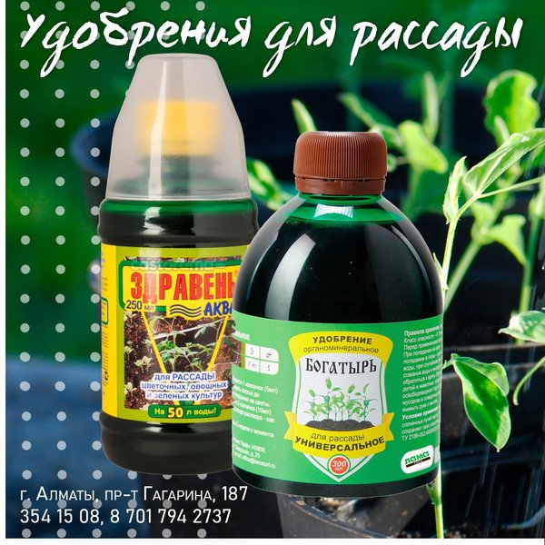 зных культур). ⠀⠀⠀⠀⠀⠀⠀⠀⠀⠀⠀⠀⠀⠀⠀ Необходимо выбрать один вид удобрения, а не применять все вместе. ⠀⠀⠀⠀⠀⠀⠀⠀⠀⠀⠀⠀⠀⠀⠀ Удобрения вносят не чаще, чем раз в месяц. ⠀⠀⠀⠀⠀⠀⠀⠀⠀⠀⠀⠀⠀⠀⠀ Летом (в июне) азотные удобрения меняем на фосфорные или оставляем для применения комплексные Фертика, Yara, Гуми-Оми, Здравень, Гумат калия. ⠀⠀⠀⠀⠀⠀⠀⠀⠀⠀⠀⠀⠀⠀⠀ В августе фосфор меняем на калийные удобрения: Гуми-Оми-калий, Сульфат калия или Калий хлористый (для декоративных культур). Водорастворимое Ferticare Kombi заменяем на Ferticare Hydro. Также можем применять нитроаммофоску и удобрение Фертика осеннее. ⠀⠀⠀⠀⠀⠀⠀⠀⠀⠀⠀⠀⠀⠀⠀ При недостатке некоторых элементов питания вносим опрыскиванием каждые три дня в течение 2 недель, до изменения цвета листьев до нормального. При недостатке железа — хелат железа, Феровит. При недостатке Магния — нитрат магния весной и сульфат магния летом. При недостатке Марганца — хелат марганца или сульфат марганца. При недостатке Цинка — хелат цинка. ⠀⠀⠀⠀⠀⠀⠀⠀⠀⠀⠀⠀⠀⠀⠀ Если на томатах в этом году уже проявлялась вершинная гниль, то в начале вегетации сделайте 2—3 подкормки Калийной селитрой. ⠀⠀⠀⠀⠀⠀⠀⠀⠀⠀⠀⠀⠀⠀⠀ Недостаток Бора компенсируем применение удобрения Борогум. ⠀⠀⠀⠀⠀⠀⠀⠀⠀⠀⠀⠀⠀⠀⠀ Напоминаем, что до 15 ноября действует скидка 40% на все товары для сада. ⠀⠀⠀⠀⠀⠀⠀⠀⠀⠀⠀⠀⠀⠀⠀ Успейте купить выгодно! ⠀⠀⠀⠀⠀⠀⠀⠀⠀⠀⠀⠀⠀⠀⠀ Алматы, пр-т Гагарина 187 (выше ул. Утепова, справа)
