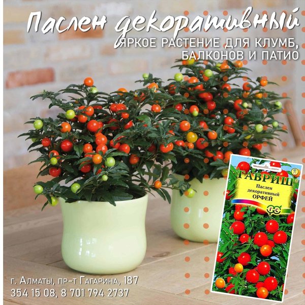 всходов. Листья светло-зеленые овальные, длиной 3—5 см. Цветки белые, звездчатые, до 1 см, одиночные или собраны в небольшие соцветия. Плоды несъедобные (), круглые, глянцевые, ярко-красные, висят на растении до Нового года и более. ⠀⠀⠀⠀⠀⠀⠀ Паслен свето- и теплолюбив, требует регулярного полива летом и умеренного зимой. Семена высевают в середине февраля при температуре почвы 21°C. Почвенную смесь готовят из равных частей листовой, дерновой земли, перегноя, торфа и песка. Рекомендуется для декоративного оформления комнат, вестибюлей, офисов, зимних садов. ⠀⠀⠀⠀⠀⠀⠀ Может использоваться как однолетняя культура для клумб, бордюров, балконов и патио-двориков. В открытый грунт высаживают после того, как минует угроза заморозков. Подкормки производят каждые 2 недели. На зиму растение заносят в помещение. ⠀⠀⠀⠀⠀⠀⠀ Стоимость семян составляет 100 тг/уп (12 семян). ⠀⠀⠀⠀⠀⠀⠀ Алматы, пр-т Гагарина 187 (выше ул. Утепова, справа)