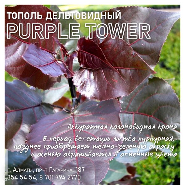 Шикарный сорт-новинка, получивший золотую медаль на выставке растений в Москве в 2011 г. Это тополь дельтовидный Purple Tower. ⠀⠀⠀⠀⠀⠀⠀⠀⠀⠀⠀⠀⠀⠀⠀ Сорт зимостойкий, устойчивый к неблагоприятным условиям. Пригоден для посадки в черте города. Растет быстро — за год становясь выше примерно на 0,5 м. Высота взрослого растения составляет около 15 м и диаметр – 3—4 м. В период вегетации листва пурпурная, позднее приобретает темно-зеленую окраску и осенью окрашивается в огненные цвета. Листья блестящие, глянцевые, крупные (длиной до 20 см). В апреле-мае… — Читать дальше