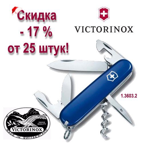 Еще одно спецпредложение к стремительно приближающемуся Новому 2017 году. Для компаний, где привыкли определяться с подарками и поздравлениями заблаговременно, у нас особенное предложение на легендарные армейские ножи от знаменитого бренда — Victorinox — Spartan 1.3603.2 Скидка 17%, при заказе от 25 штук. Только до 01.01.2017 года, Вы можете купить Victorinox Spartan 1.3603.2 по цене 6224 тенге вместо 7500, при заказе от 25 штук.
