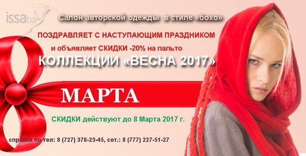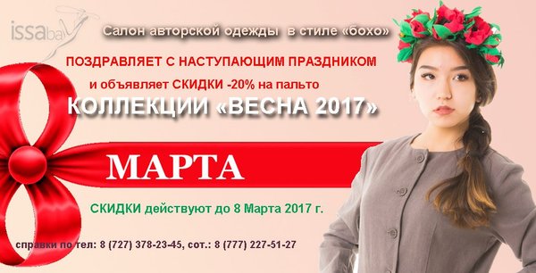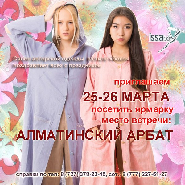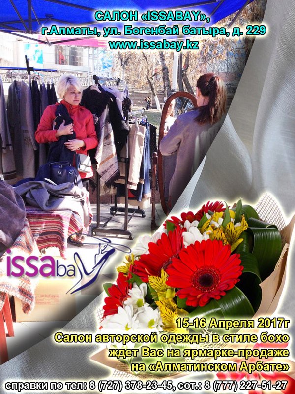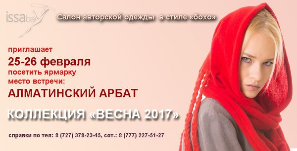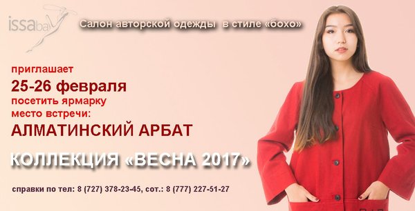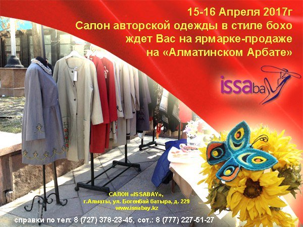 Салон авторской одежды бохо Issabay приглашает посетить наш стенд на ярмарке ремесел в г.Алматы 25—26 февраля 2017 г. Место встречи — АЛМАТИНСКИЙ АРБАТ.