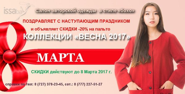 Салон «Issabay» объявляет скидки -20% на демисезонные пальто Коллекции «Весна-2017». Ждем Вас в нашем салоне. Скидки действуют до 8 Марта 2017 года!