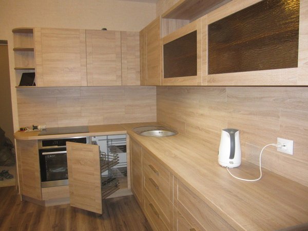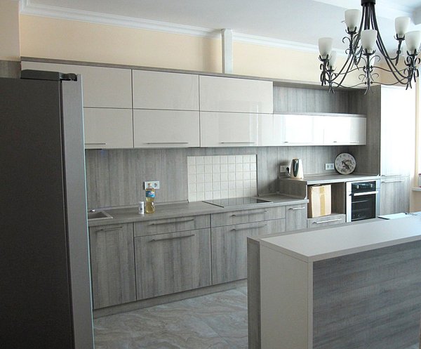 Минимализм — стиль дизайна, который выводит на передний план форму кухонной мебели. Для этого стиля типичны простые линии и геометрические формы. Для данного проекта кухни на заказ были использованы ЛДСП с фактурой дерева для каркаса шкафов, фасадов столов, кухонного фартука и столешницы. Для создания контраста фасады верхней и левой секций были сделаны из материала Polygloss. Также были использованы push механизмы, которые помогли сохранить чистые линии кухни. А современная серия электрической бытовой техники дополнила целостный вид кухни. Зак… — Читать дальше