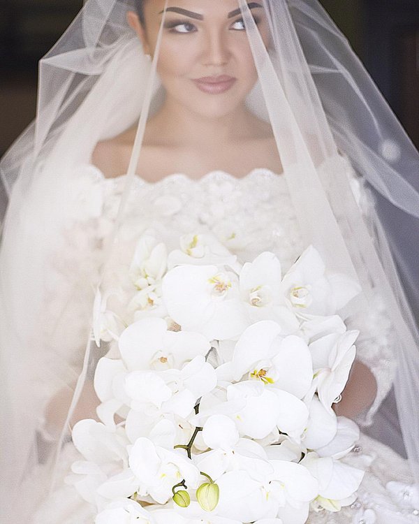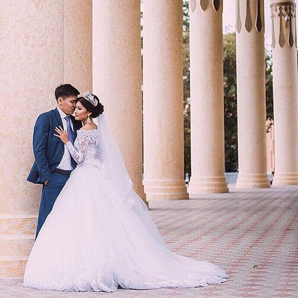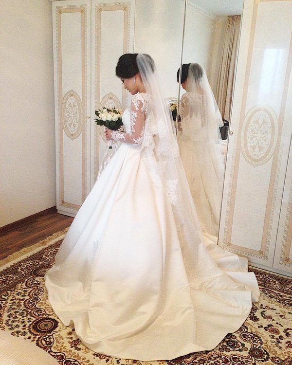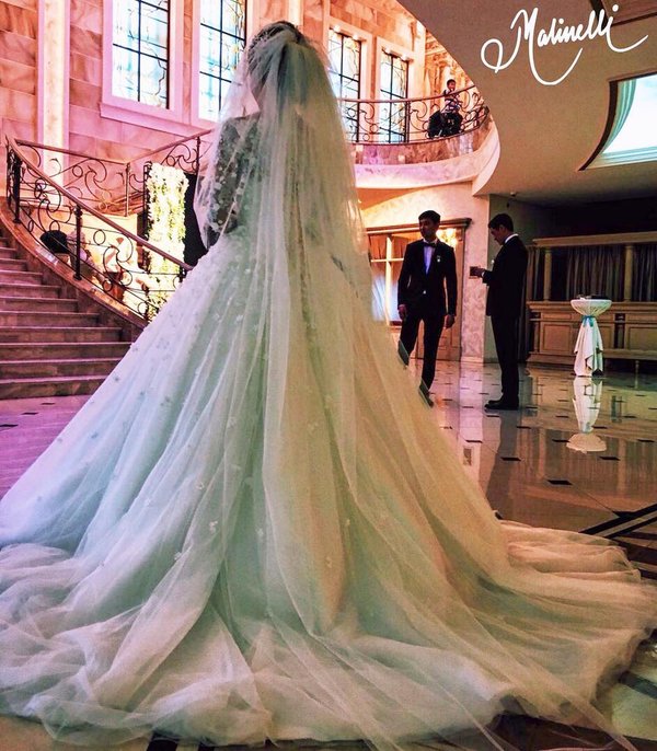 Некоторые свадебные платья навсегда вошли в историю свадебной моды. Мы уверены, что королевскому образу элегантной Жанар приготовлена та же судьба. Наряд Malinelli из роскошной ткани, с длинным шлейфом и объёмными элементами декора никого не оставит равнодушным.