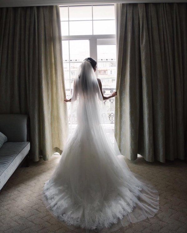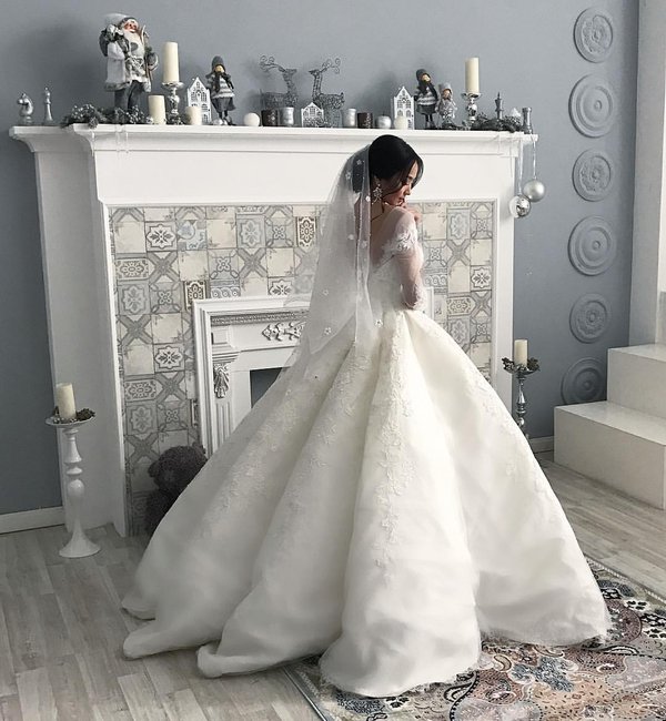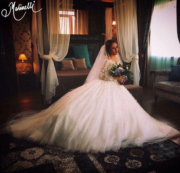 Когда фата — продолжение подола платья, то образ получается особенно торжественным и элегантным, как у невесты Malinelli Рабии.