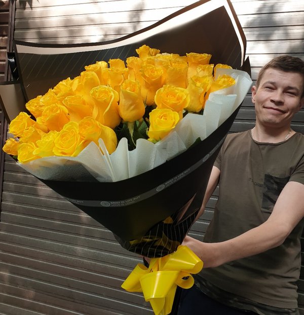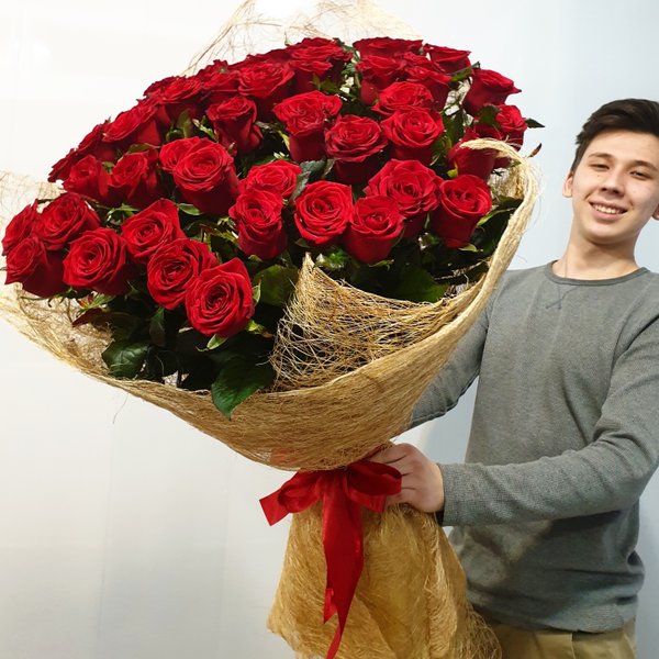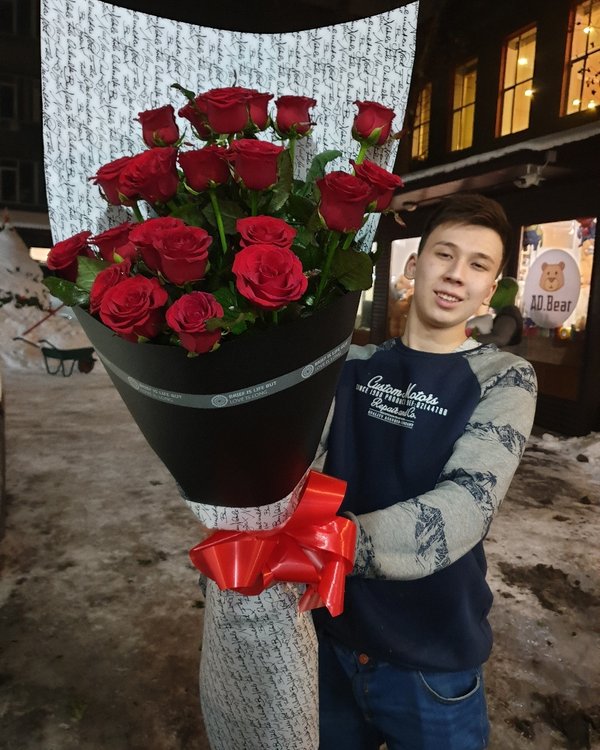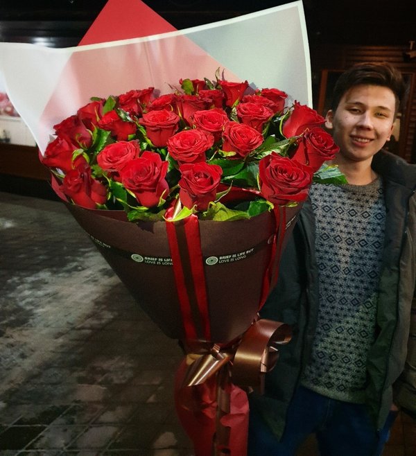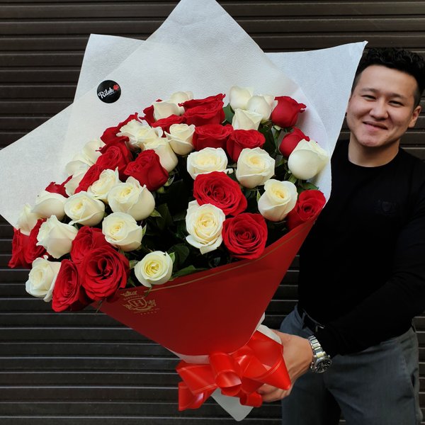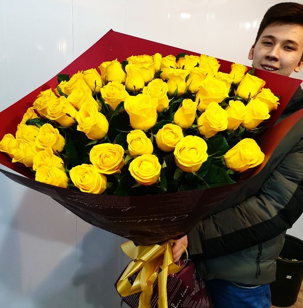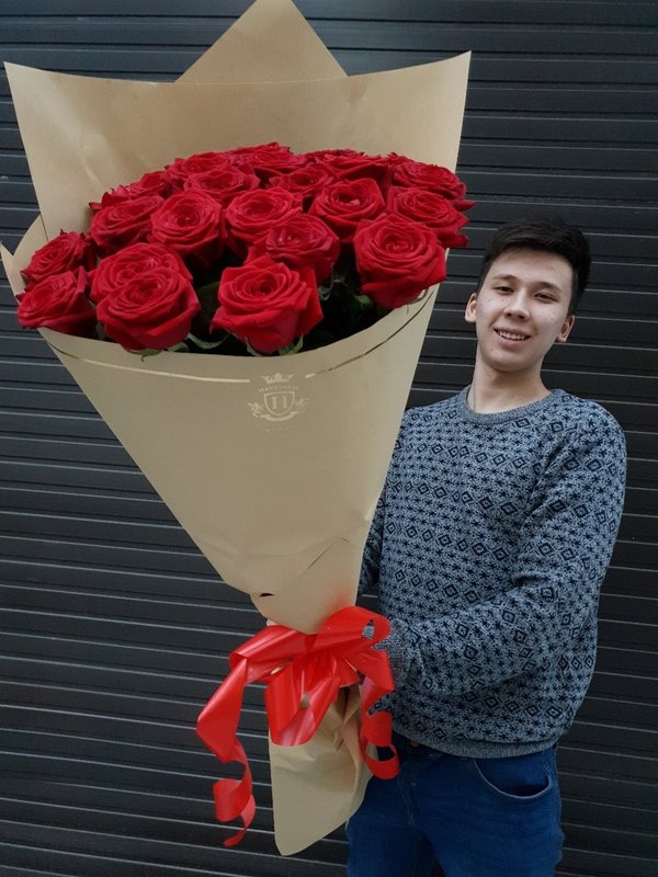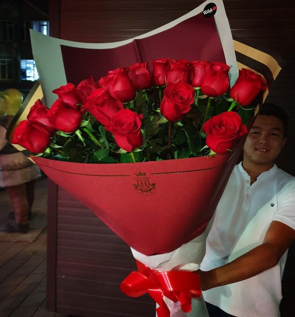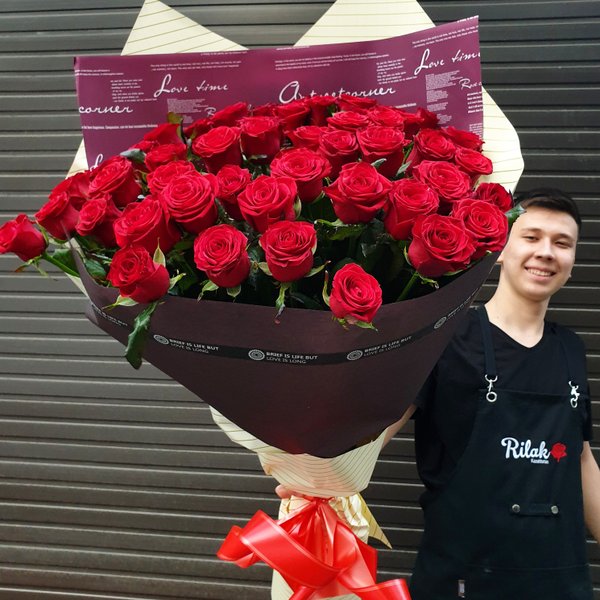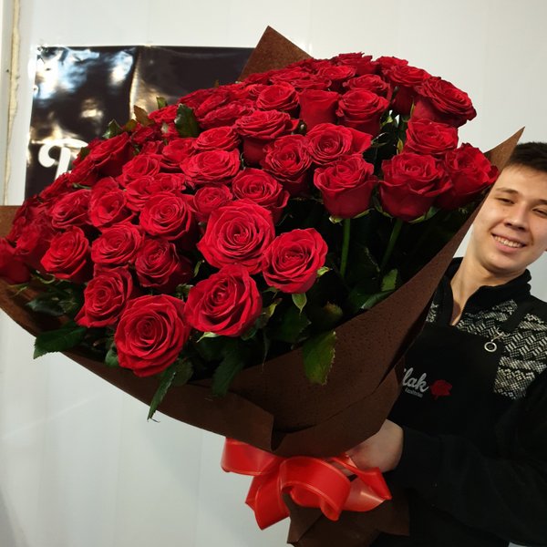С роскошным букетом из 55 роз высотой 100см отправляемся на доставку в городе Алматы ЦЕНА БУКЕТА: 25000тг всем приятного вечера и отличного настроения