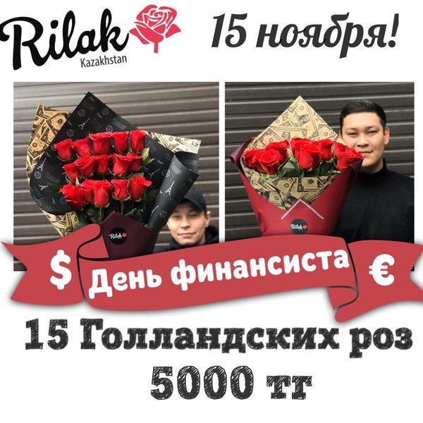 Дорогие друзья!!! Близится большой профессиональный праздник «День ФИНАНСИСТА» Специально к этому дню, мы придумали тематический букет Не забудьте поздравить своих Финансистов 15 Голландских роз = 5000тг 25 Голландских роз = 8000тг 51 Голландская роза = 15000тг 101 Голландская роза = 27000тг Доставка по городу от 1000тг Заказ по номеру: Дарите радость вместе с нами