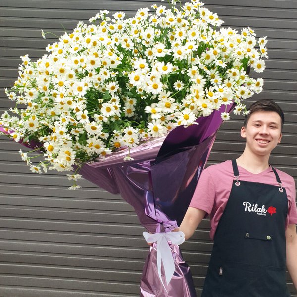 Гигантские ромашки Букет: ромашки Сорт: ромашки Высота букета: 140см Оформление: зеркальный глянец Цена: 8000тг Флорист: @bilisbekov.boka Заказ по номеру: