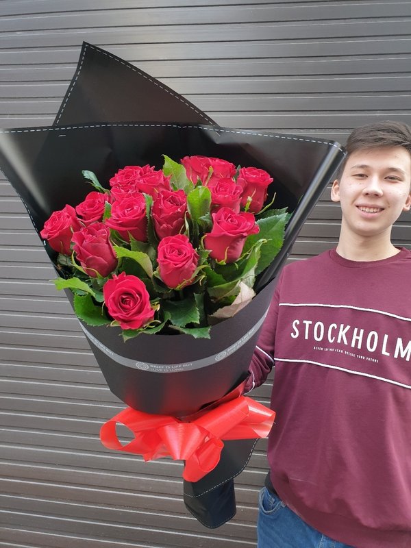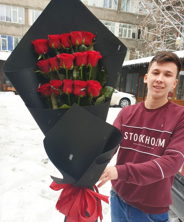С шикарным букетом из 15 роз сорта Anna высотой 100см цена по акции: 8000тг