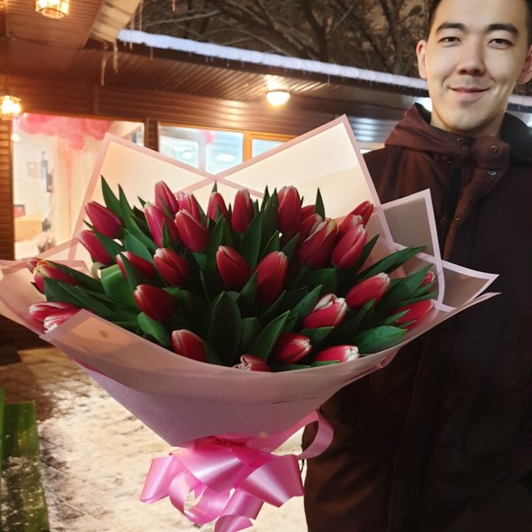 С роскошным букетом из 35 тюльпанов весна близко, друзья цена: 14000тг