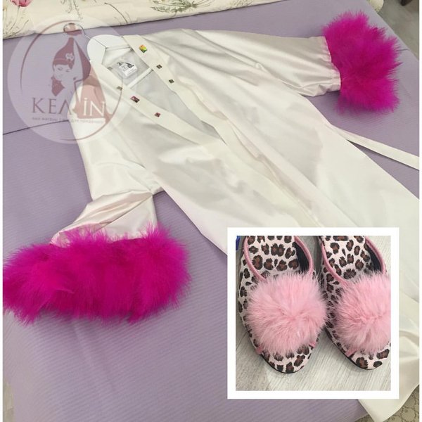 Для оригинальности вашего образа в свадебный день или девичник, мы разработали халатик с яркими перьями и стразами на воротнике. Перья съемные,так что ваш образ можно будет легко трансформировать! К дополнению можем предложить тапочки с пушком Цена халата 25 000 тг Тапочки 7500 тг @ Пушкина Курмангазы