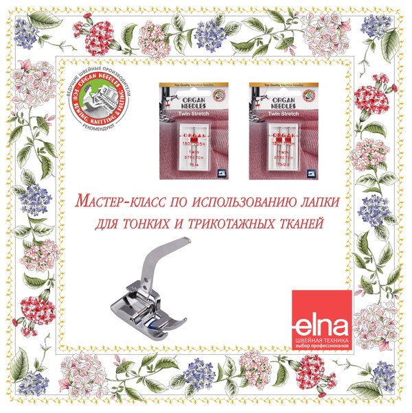 Школа шитья Elna (16.05.2017): Дорогие друзья! Сегодня мы хотим поделиться с вами небольшим секретом, как при помощи специальной лапки и двойных игл Organ можно с легкостью работать с тонкими и трикотажными тканями. Подробно с мастер-классом можно ознакомиться по ссылке: Мастер-класс мы выполнили на электромеханической швейной машине швейцарской серии с запатентованной оверлочной строчкой Elna 3005.