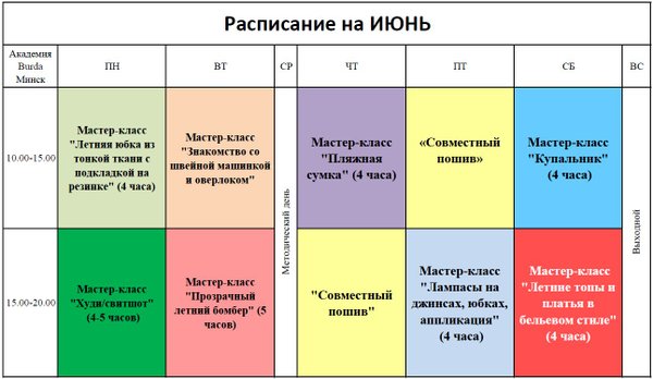 ВНИМАНИЕ друзья! Академия Burda Минск с 14 июня уходит на двухнедельные КАНИКУЛЫ! Но до 14 числа мы готовы интенсивно поработать! Давайте пошьем вместе))!!! Темы мастер-классов в расписании! Звоните, пишите, приходите!