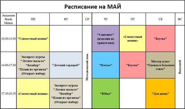 Академия Burda Минск предлагает расписание на МАЙ! Ключевое слово «предлагает»! Если Вы хотите шить, шить вместе с нами, но Ваше расписание не согласуется с нашим, всё равно звоните и приходите, — что-нибудь придумаем. Мы работаем для Вас и готовы корректировать наш график работы, учитывая интересы всех студентов. И очень большая просьба Мы всегда перезваниваем по оставленным телефонам, но иногда не получается дозвониться (по разным причинам – занятия активно проходят, телефон некорректно записан, абонент не в сети и т.д.). Будьте понастойчиве… — Читать дальше