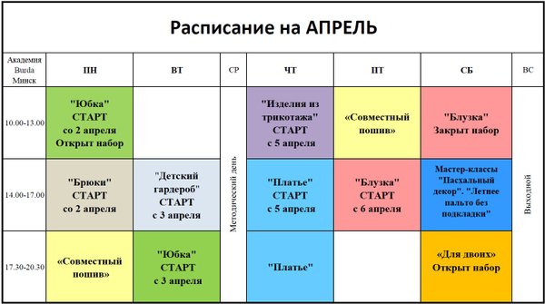Друзья! Расписание на АПРЕЛЬ! Март проходит в Академии очень активно! Студентки готовы заниматься шитьем более 6 часов в день!!! А мы и не против))!!! Фотоотчеты с хроникой наших мартовских занятий опубликуем в самое ближайшее время. А пока, приглашаем всех желающих в стартующие в первых числах АПРЕЛЯ новые группы!!!