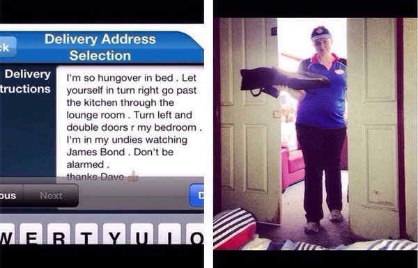 Указания по доставке пиццы «Я в кровати с диким похмельем. Заходите в дом, поверните направо, пройдите мимо кухни через гостиную. Поверните налево, там за двустворчатой дверью моя спальня. Я в трусах смотрю «Джеймса Бонда». Пусть это вас не тревожит. Спасибо. Дэйв»