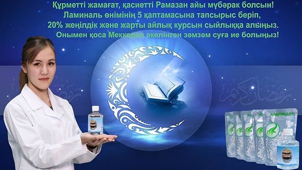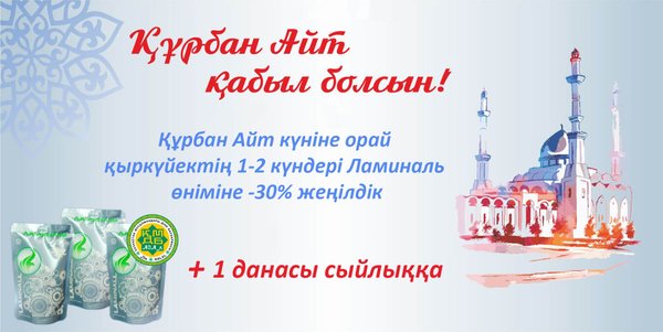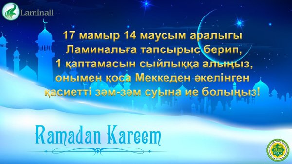 Құрметті жамағат қасиетті Ораза Айт қабыл болсын! Тілеген дұға, тілектеріңіз Алланың құлағына шалынсын! Ораза Айт мерекесіне орай Ламиналь денсаулық орталығында арнайы науқан, ламинальдың 5 қаптамасына тапсырыс беріп, жарты айлық курсын сыйлыққа алыңыз. Онымен қоса қасиетті замзам суына ие болыңыз! Whats App,