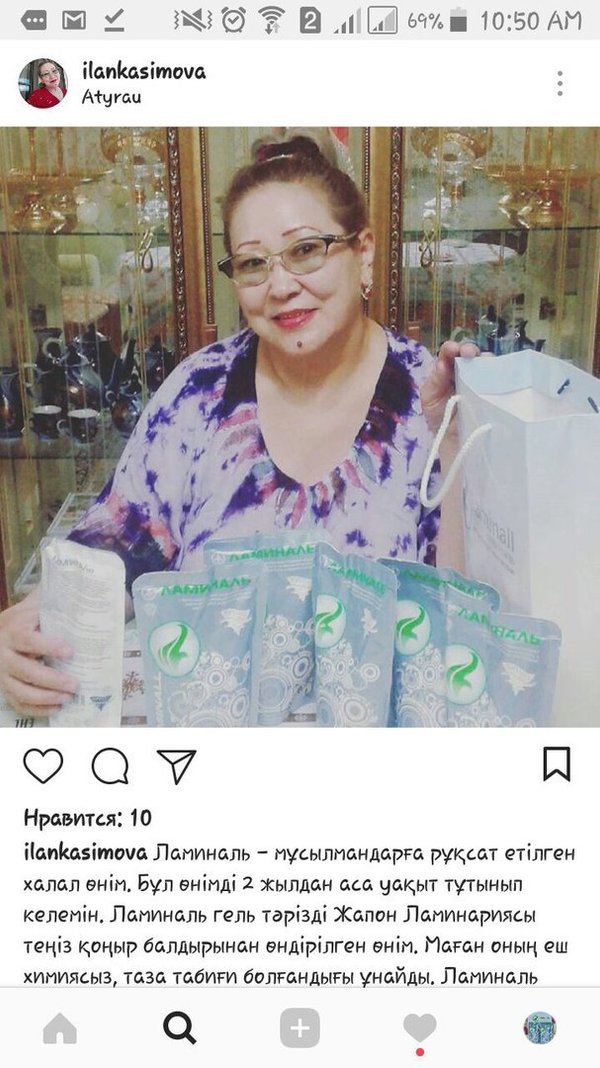 Көптен бері «Ламиналь» өнімі жайлы еститінмін. Бүгін осы өнімді алғаш рет пайдаланғалы отырмын. Естуімше, теңіздің қоңыр балдырларынан жасалған таза табиғи биогель, әр түрлі ауру-сырқатқа шипасы бар дейді. Ал, енді, иммунитетті жақсартуға ниеттеніп, ішіп көрейін дедім. Бұйырса алдағы уақыттарда нәтижеммен бөлісетін боламын. Ең бастысы — денсаулық қой, ағайын! Аман болайық!@Laminallkz