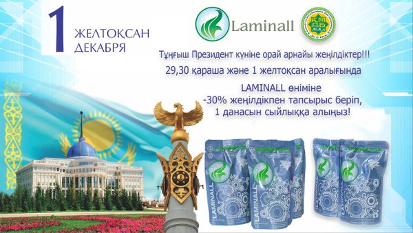 Тұңғыш Президент күніне орай арнайы жеңілдіктер!!! 29, 30 қараша және 1 желтоқсан аралығында LAMINALL өніміне -30% жеңілдікпен тапсырыс беріп, 1 данасын сыйлыққа алыңыз!