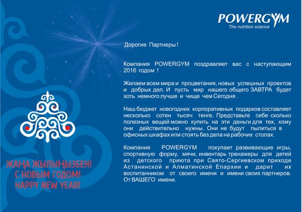 Дорогие Клиенты, Коллеги, Партнеры! Компания POWERGYM поздравляет вас с наступившим новым 2016 годом! Желаем всем мира и процветания, новых успешных проектов и добрых дел. И пусть мир нашего общего ЗАВТРА будет хоть немного лучше и чище чем Сегодня. Наш бюджет новогодних корпоративных подарков составляет несколько сотен тысяч тенге. Представьте себе сколько полезных вещей можно купить на эти деньги для тех, кому они действительно нужны. Они не будут пылиться в в офисных шкафах или стоять без дела на рабочих столах. Компания POWERGYM покупает… — Читать дальше