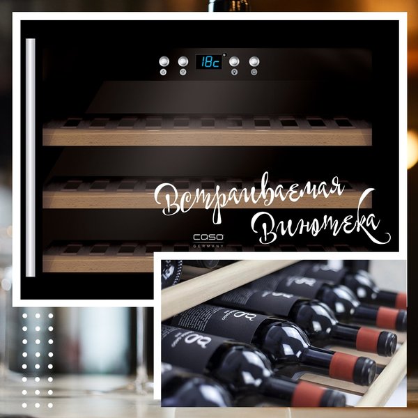 Винотека CASO Модель: WINESAFE18EB02C8 Код товара: 200 27 028/2 Встраиваемая винотека Электронное управление Цифровой дисплей Диапазон температур от 5 до 22 С° 3 деревянные полки Материал полок: дерево Вместимость: 18 бутылок (0,75) Голубая LED подсветка Стекло, не пропускающее UV-лучи Система против образования конденсата Система против вибрации Класс энергопотребления А+ Цвет: черное стекло Ручка: нержавеющая сталь Дверка НЕ перенавешиваемая! Мощность: 60 Вт Уровень шума: 39 дБ Размеры (ВxШxГ): 445×55… — Читать дальше