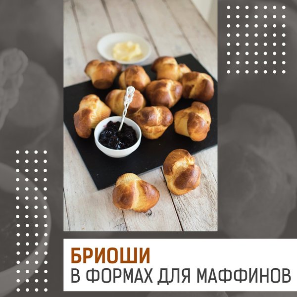 сто не станет однородным и гладким. Следом добавьте масло по одной столовой ложке, продолжая перемешивать. Закройте чашу с тестом плёнкой или пластиковой крышкой и поставьте в теплое место, чтобы тесто поднялось. Когда оно увеличится в объеме примерно вдвое (для этого потребуется примерно полтора часа), обомните тесто и поместите его в холодильник. Каждые полчаса проверяйте тесто и еще раз обминайте до тех пор, пока оно не перестанет подниматься. Оставьте тесто в холодильнике на ночь. Смажьте маслом 12 форм для маффинов. Разделите тесто на 12 частей, а затем каждую часть на 3, скатайте шарики и положите в каждую из форм по три шарика. Накройте формы полотенцем и дайте тесту подняться примерно полчаса. Нагрейте духовку до 200 °С. Поместите формы на противень, смажьте поднявшееся тесто яичной глазурью. Выпекайте бриоши в течение 20 минут, выньте из духовки и дайте немного остыть. Подавайте к столу теплыми или комнатной температуры. Приятного аппетита!