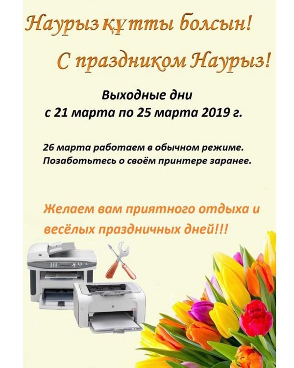 Сервисный центр Офис Принт поздравляет всех казахстанцев и своих клиентов с национальным праздником Наурыз Это праздник весны и обновления, когда вся природа оживает, всё обновляется, рождаются новые надежды. В этот светлый праздник хотим пожелать Вам, чтобы каждый Ваш день был наполнен светом, весенним теплом, а Ваш дом достатком и благополучием. Пусть все болезни, неудачи и невзгоды обходят Вас стороной. Откройте свою душу солнцу, миру, добру, любви и красоте! С уважением, коллектив сервисного центра @office_print_almaty График работы в п… — Читать дальше