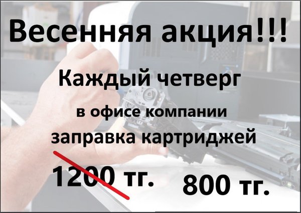 Вот и наступила долгожданная весна!!!С первым днём весны Спешим обрадовать вас нашей новой Весенней акцией!!! Акция действует только в офисе нашей компании ул. Брусиловского 163, ЖК Манхеттен, офис 6а (вход с ул. Брусиловского цокольный этаж) и только по четвергам с 9.00—18.00, перерыв 13.00—14.00. Акция действует только на заправку картриджей стоимость которых 1200 тенге. ️Скидка только на заправку картриджа и тонер, не распространяется на замену запчастей, если это необходимо. Сервисный центр FELIS WhatsApp),