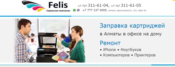 Заправка картриджей в Алматы: — в офисе — на дому Ремонт: — Ноутбуков — Компьютеров — Принтеров Сервисный центр FELIS Ждем Вас по адресу ул. Брусиловского 163, ЖК Манхеттен, офис 6а (вход с ул. Брусиловского цокольный этаж) тел. WhatsApp),