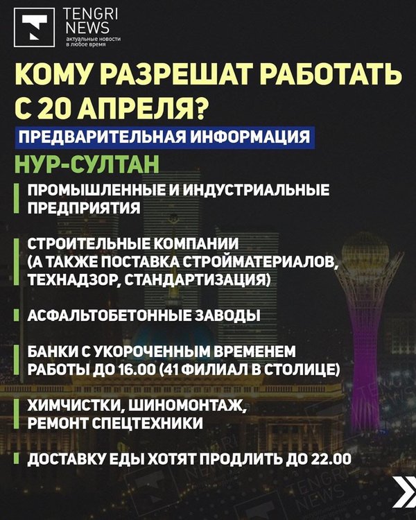 Надеемся на разрешение работы. Так что следим за новостями. По решению Госкомиссии с 20 апреля ряд секторов экономики Нур-Султана и Алматы возобновят работу. Окончательный список организаций будет утвержден 15 апреля. Процесс ослабления режима карантина будет проводиться поэтапно.