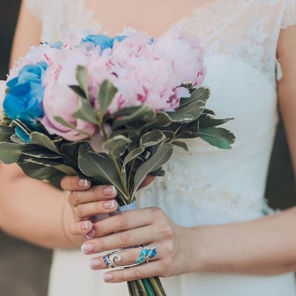 Нежная невеста выбрала на самое главное торжество в своей жизни серебряное кольцо на две фаланги с фианитами в голубой палитре