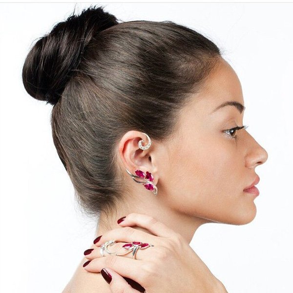 Серебряные каффы на ухо и бандажное кольцо на весь палец со сгибающимися механизмом, не сковывая движения, вставки малиновые фианиты.