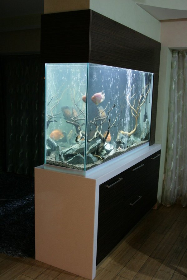 ие водного мира вашего аквариума. Для начала следует выбрать плоскую горизонтальную поверхность, куда вы сможете его установить. Как правило, для этих целей удобнее всего использовать тумбочку, комод или стол. Кроме того, поверхность должна иметь достаточную прочность, так как вес большого аквариума, наполненного водой, будет также немалым. Специалисты рекомендуют расположить под аквариумом лист полистирола, который позволит лучше распределить нагрузку, а также сгладит неровности между аквариумом и поверхностью, что позволит избежать возможных перекосов. Не забывайте и о наличие поблизости электрической розетки, ведь она будет необходима для подключения специализированного оборудования. Не рекомендуется размещать аквариум возле окна, где на него будут воздействовать прямые солнечные лучи. Именно под их влиянием водоросли будут вырабатывать ферменты портящие воду, а камушки и стенки будут постепенно покрываться зеленой слизью, которая не только испортит красоту, но и навредит рыбкам. Такой процесс в народе еще называют «цветением» воды. Как правило, он происходит только в летний период времени. Нельзя располагать аквариум в местах значительного перепада температур. В холодные времена года близкое расположение аквариума к окну может стать причиной снижения температуры воды, особенно ночью, когда обогреватель выключен. Аквариум следует подбирать в сочетании с цветом окружающей мебели. Для месторасположения аквариума более предпочтительной будет мебель темных оттенков, на ее фоне освещенный аквариум смотрится намного эффектнее. Не рекомендуется использовать вокруг аквариума броские предметы, отвлекающие от него взгляд. Кроме того, не следует устанавливать аквариум поблизости от устройств, издающих громкие звуки, таких как музыкальный центр, телевизор и так далее – рыбы, как и люди, тоже любят покой. Не размещайте аквариум и вблизи дверей – постоянные перемещения домочадцев мимо него вызывают у рыб беспокойно поведение и стрессовое состояние. Обеспечьте хорошую доступность как к аквариуму, так и к его техническим составляющим. Расположенные над аквариумом элементы мебели не должны осложнять его обслуживание. Расположение аквариума по высоте следует подобрать такое, чтобы его центр визуально располагался на уровне глаз подошедшего к нему человека.