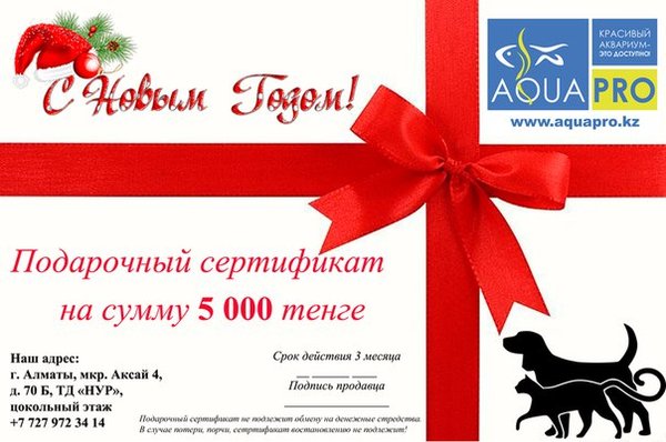 Не знаете что подарить на Новый год? А мы знаем! Зоомагазин «AQUAPRO.KZ» предоставляет возможность подарить своим родным и близким подарочные сертификаты! Стоимость сертификата номиналом 5.000тг - 4.500тг Стоимость сертификата номиналом 10.000тг - 9.000тг Срок действия сертификата — 3 месяца.