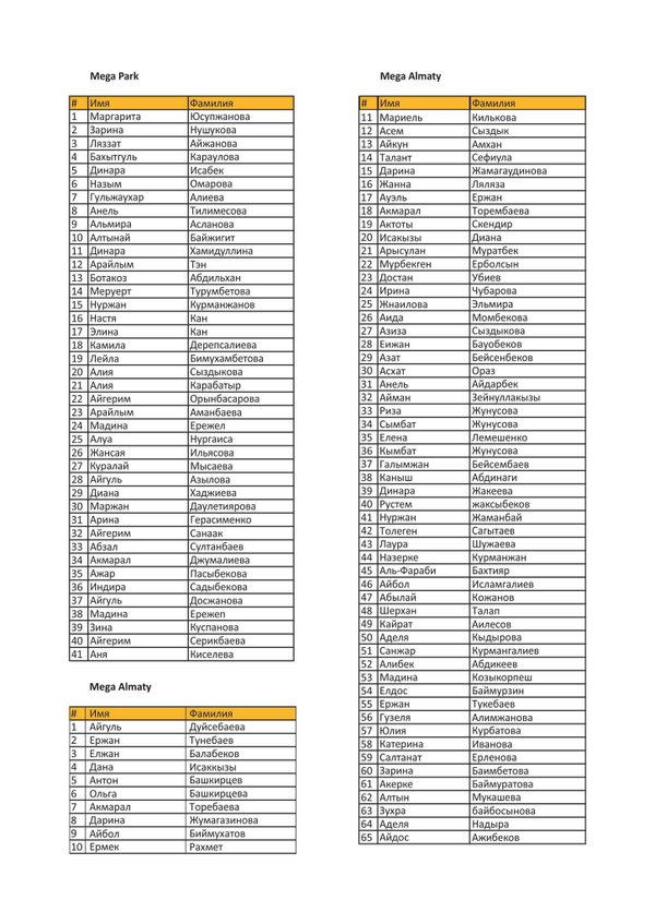 ТРЦ Mega Алматы — 61 Акерке Баймуратова; ТРЦ Хан Шатыр — 43 Айжан Айтжан; ТРЦ Аружан — 5 Асем Калиева; ТРЦ Mega Шымкент — 8 Ирина Чолукова; ТРЦ Alem Plaza — 7 Наталья Власова; Мы свяжемся с вами в ближайшие дни!!!