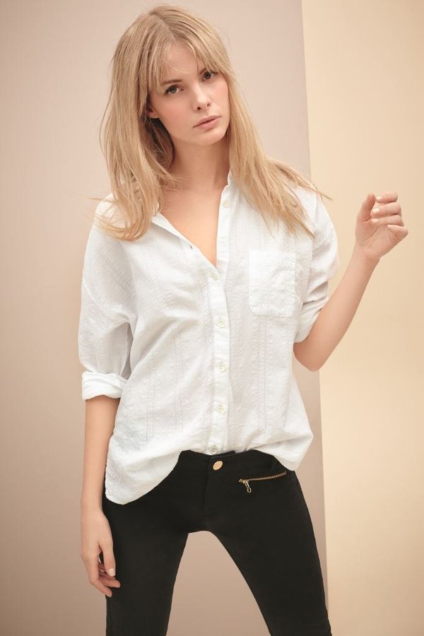 Белая рубашка и темные джинсы — идеальный образ для начала рабочей недели.